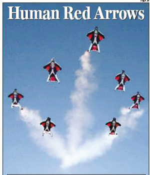 當(dāng)“Topgun”表演時(shí),16名隊(duì)員的飛行時(shí)速可以達(dá)到驚人的193公里,但每名隊(duì)員之間的距離有時(shí)只有幾英寸之遠(yuǎn)。他們猶如一只只巨大的蝙蝠在空中急速穿梭,并以密集編隊(duì)在空中翻飛并不停變換隊(duì)形,其技巧和真正的“紅箭”飛行表演隊(duì)不相上下,精湛技術(shù)令人叫絕,壯觀(guān)場(chǎng)面可謂酷到極點(diǎn)。但顯然和“紅箭”不同的是,他們表演時(shí)無(wú)須使用任何飛機(jī),全憑自己的身體在空中“肉搏”。