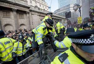 據(jù)英國《獨(dú)立報》報道,在G20峰會即將召開的前夕,大批示威者涌上倫敦街頭,其中一些人甚至拿起了棍棒,同警察發(fā)生了肢體沖突。英國央行遭圍堵,蘇格蘭皇家銀行的辦公設(shè)備被砸爛,趨向暴力的抗議活動已經(jīng)令倫敦亂作一團(tuán)。