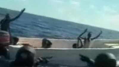 據(jù)英國媒體報道,5月4日,法國海軍將抓獲11名索馬里海盜的錄像公布于眾。法國海軍在塞舌爾島以外海域俘虜11名索馬里海盜。當時,這些海盜蔣法國軍艦誤認為是商船。據(jù)報道,事實上,海盜們想襲擊的是參與歐盟打擊海盜行動、在當?shù)睾S蜓策壍姆▏鴮椬o衛(wèi)艦“雪月號”。