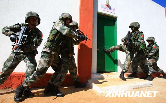 12月7日,在印度貝爾高姆地區(qū),中方參訓(xùn)分隊(duì)進(jìn)行房屋清剿戰(zhàn)術(shù)演示