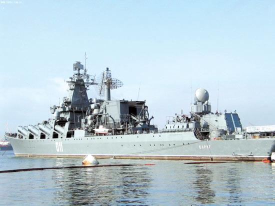 俄羅斯海軍也派出素有“航母殺手”之稱的“瓦良格”號導(dǎo)彈巡洋艦參加此次閱兵式。該艦已于13日從符拉迪沃斯托克的金角灣出發(fā)前往中國!巴吡几瘛碧柺嵌砹_斯太平洋艦隊(duì)的旗艦,主要武器為16枚SS-N-12超音速反艦導(dǎo)彈,可攜帶1000公斤裝藥的常規(guī)彈頭或射程達(dá)300海里的戰(zhàn)術(shù)核彈頭。