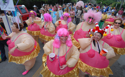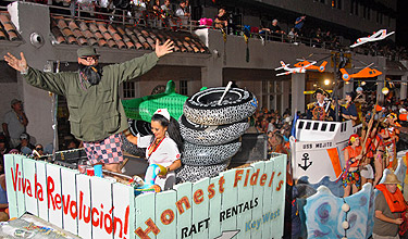 歷時10天的活動里,彩車上的人們有的身著盛裝,有的扮成動物,甚至有幾名女子打扮成前白宮實習(xí)生萊溫斯基的樣子,也有狂歡者站在花車上撒錢。