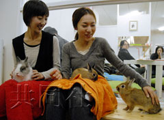 中新網(wǎng)1月6日電 可以讓顧客和兔子親密接觸的“兔兔咖啡館”去年7月在日本名古屋東區(qū)開張,除了帶孩子的父母和女性客人以外,許多下班回家的公司職員也經(jīng)常光顧,生意非常興隆。該店“園長”倉田直基(36歲)說:“兔子有著心靈治療的神奇力量。人們都喜歡和它們接觸,獲得內(nèi)心的平和!