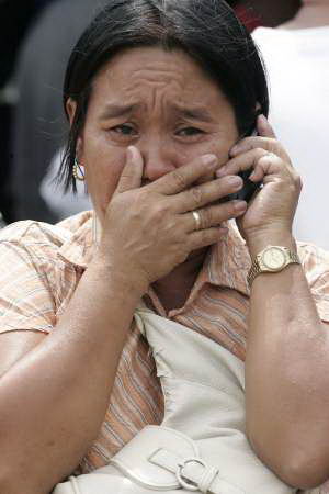 “群星公主”號渡輪乘客和船員親屬在宿務等待消息時對蘇爾皮西歐船運公司的雇員尖叫。一位婦女對該公司的一名雇員稱:“你無法讓我們的親人回來,你應當對此負責!碧K爾皮西歐船運公司稱,它將向每位遇難者的家屬支付20萬比索(4500美元)的賠償,向幸存者支付一定數(shù)量的金錢。(黃歡)