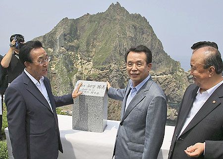 韓國國務(wù)總理韓升洙(中)7月29日搭乘直升機(jī),飛往獨(dú)島(日本稱竹島)視察,并在寫有“獨(dú)島”的石牌前留影,宣示主權(quán)。