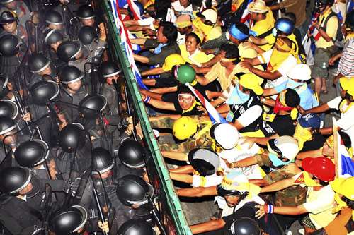 本月二十六日,民盟的支持者在曼谷舉行大規(guī)模示威,沖擊政府部門并占領(lǐng)總理府。盡管泰國民事法院發(fā)出命令,要求示威者撤出總理府,但領(lǐng)導(dǎo)示威的民盟拒絕執(zhí)行法院命令,繼續(xù)在總理府內(nèi)舉行示威。