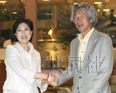 日本前首相小泉純一郎與前防衛(wèi)相小池百合子握手。(共同社圖)