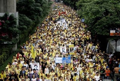 中新網(wǎng)10月31日電 據(jù)“中央社”報(bào)道,泰國擁政府派誓言10月31日展開集會,加上反政府的人民民主聯(lián)盟群眾30日凌晨遭手榴彈攻擊,社會對立的緊張氣氛高漲。分析認(rèn)為,緊張氣氛恐怕在11月1日前總理他信越洋聯(lián)機(jī)活動當(dāng)天達(dá)高峰。