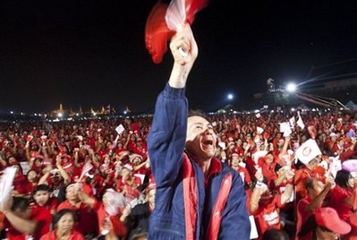 抗議群眾阻斷在泰國(guó)首都國(guó)會(huì)大廈前的道路,圍住國(guó)會(huì)入口,誓言將留守直到阿披實(shí)辭職。