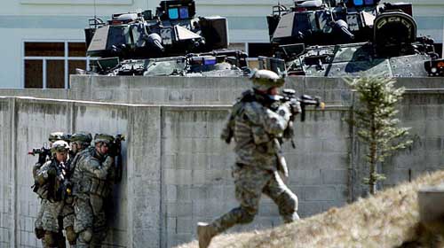 中新網(wǎng)3月11日電 據(jù)韓國《中央日報》報道,10日是韓美“關(guān)鍵決斷(key resolve)”聯(lián)合軍事演習的第二天,京畿道抱川駐韓美軍羅德里格斯(Rodriguez)射擊場上,韓美海軍展開巷戰(zhàn)訓練。美軍士兵正朝著假想敵軍占領的建筑物前進。