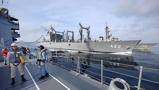 兩艘護衛(wèi)艦14日從日本廣島縣吳基地出發(fā),28日曾接受依據新《反恐特措法》在印度洋執(zhí)行任務的海上自衛(wèi)隊補給艦的供油。