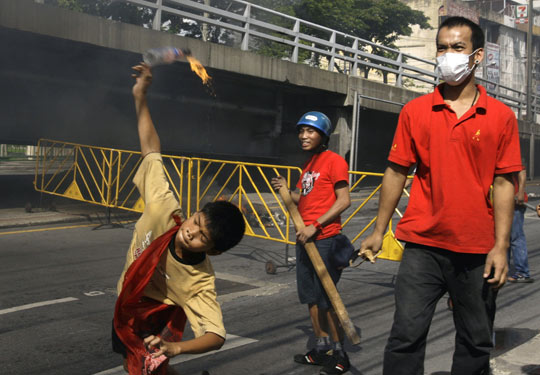沖突點(diǎn)距離“紅衫軍”抗議主場——曼谷總理府——只有數(shù)公里。軍方和示威者以催淚瓦斯、實(shí)彈和汽油彈互相攻擊。至中午時(shí)分,軍方向市中心的示威者開槍并發(fā)射高壓水炮。