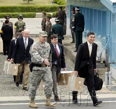 美國(guó)國(guó)務(wù)院朝鮮半島事務(wù)科科長(zhǎng)金成(右端)一行手提可能裝有朝鮮核開(kāi)發(fā)計(jì)劃文件的箱子通過(guò)板門店進(jìn)入韓國(guó)境內(nèi)。(共同社圖)