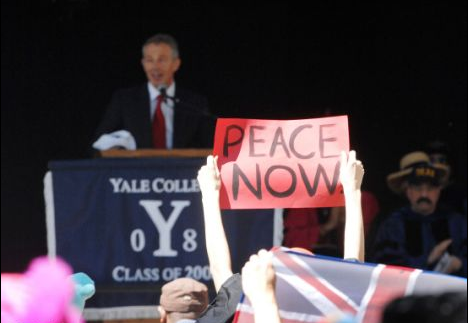 布萊爾在抵達(dá)耶魯大學(xué)遇到了一小群示威者,他們揮動(dòng)著寫有“對布萊爾說不”、“耶魯!不要支持一名戰(zhàn)犯”的標(biāo)語牌,警方?jīng)]有讓這些示威者進(jìn)入講演會(huì)場。講演是在一個(gè)有門的大花園內(nèi)進(jìn)行的。但當(dāng)54歲的布萊爾走上主席臺時(shí),一些學(xué)生展示了紅色的標(biāo)語,上面寫著“現(xiàn)在就實(shí)現(xiàn)和平”、“不要戰(zhàn)爭”。學(xué)生是將這些標(biāo)語放在畢業(yè)袍里帶進(jìn)會(huì)場的。一名戴著頭巾的女學(xué)生在布萊爾講演時(shí)一直站著,她在距布萊爾約3米遠(yuǎn)的地方舉著“現(xiàn)在就要和平”的標(biāo)語。布萊爾看起來非常努力地不去看那名女學(xué)生。布萊爾在講演時(shí)也未直接提到伊拉克,他在講演時(shí)談到了氣候變化的問題、由宗教加劇的恐怖主義。布萊爾將于明年在耶魯大學(xué)開信仰和全球化課程。