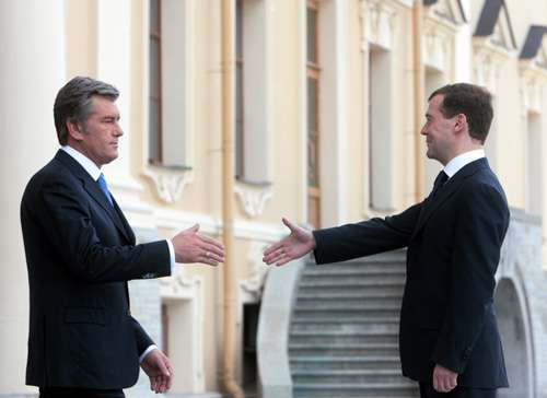 俄羅斯總統(tǒng)梅德韋杰夫(右)今年六月會(huì)見(jiàn)到訪的烏克蘭總統(tǒng)尤先科(左)。