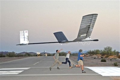 據(jù)香港《文匯報(bào)》報(bào)道,這架名為“Zephyr(微風(fēng))”的無人偵察機(jī),由英國國防公司Qinetiq制造!癦ephyr”機(jī)身由碳纖維制造,只重30公斤,飛行高度達(dá)6萬英尺,時(shí)速可達(dá)112公里,能抵受攝氏45度至零下75度的溫差!癦ephyr”60英尺(18米)長機(jī)翼上的太陽能充電板,能為它提供源源不絕的能源。