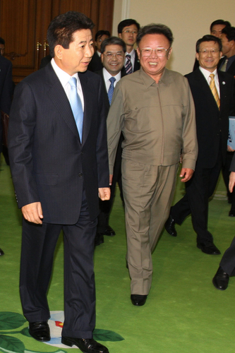 資料圖:2007年10月3日,韓國(guó)總統(tǒng)盧武鉉與朝鮮國(guó)防委員長(zhǎng)金正日舉行首次首腦會(huì)談時(shí),就金正日前一天親自出來(lái)迎接表達(dá)謝意,而金正日對(duì)此以“我又不是患者”來(lái)回應(yīng),再次表現(xiàn)出其幽默的一面。
