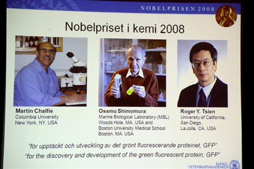 中新網(wǎng)10月8日電 綜合報(bào)道,瑞典皇家科學(xué)院諾貝爾獎委員會于當(dāng)?shù)貢r間10月8日11時45分左右(北京時間10月8日17時45分左右)宣布,將2008年度諾貝爾化學(xué)獎授予美國日裔科學(xué)家下村修(Osamu Shimomura)、美國科學(xué)家馬丁·查爾菲(Martin Chalfie),以及美國華裔科學(xué)家錢永健。他們?nèi)嗽诎l(fā)現(xiàn)和研究綠色熒光蛋白(GFP)方面有突出成就。
