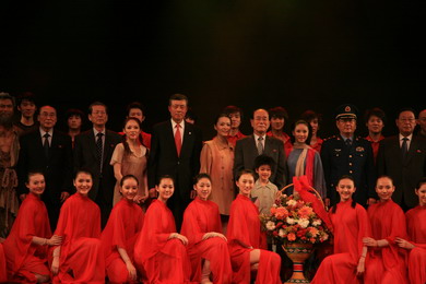演出進(jìn)行了近2小時(shí)。出席演出的朝領(lǐng)導(dǎo)人在演出結(jié)束后與演職人員一一握手,并獻(xiàn)上花籃祝賀首場(chǎng)演出成功。朝鮮觀眾們?yōu)橹x幕的演員們一一報(bào)以如潮的掌聲,臺(tái)上臺(tái)下相互揮手致意,《紅梅贊》訪朝首演完美謝幕。