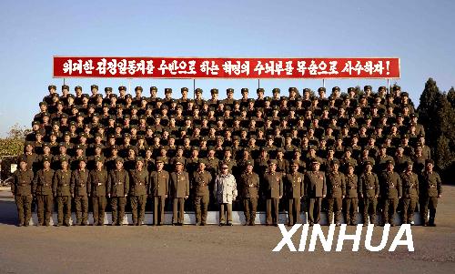 這是金正日與人民軍2200部隊(duì)官兵合影(拍攝日期不詳)。新華社/朝中社