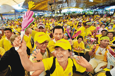 曼谷穿黃衣的反政府示威者在總理府內(nèi)發(fā)動(dòng)造勢(shì)大會(huì)。