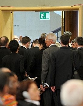 當(dāng)他說到以色列借助二次大戰(zhàn)“猶太人的痛苦”成立國家時(shí),包括英國及法國 大使在內(nèi)的幾名歐洲代表實(shí)時(shí)離場,以示抗議。法國總統(tǒng)薩科齊指摘內(nèi)賈德散播“仇恨言論”,要求歐盟各國采取強(qiáng)硬立場。聯(lián)合國人權(quán)專員的發(fā)言人亦批評內(nèi)賈德言論“不恰當(dāng)”。會議期間也至少有3名小丑打扮、戴著七彩假發(fā)及紅鼻子的法國猶太學(xué)生組織示威者,在會場上抗議內(nèi)賈德,打斷其講話。
