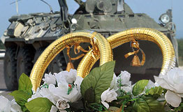 由一輛貨真價實的裝甲運兵車引導(dǎo)的婚禮車隊沿著列寧大街飛馳。龐大的裝甲運兵車裝飾著彩帶、蝴蝶結(jié)和一塊寫著“新郎哥們”的牌子。盡管在由外國品牌轎車組成的車隊中顯得有些別扭,但的確吸引了路人的眼球。