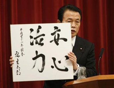 中新網(wǎng)1月6日電 據(jù)星島環(huán)球網(wǎng)報(bào)道,日本首相麻生太郎4日用了39秒鐘時(shí)間寫下了“安心活力”四個(gè)字作為自己新年的執(zhí)政目標(biāo),并于記者會(huì)上進(jìn)行了公布。然而,這一舉動(dòng)并沒有獲得國民的掌聲,卻很快引來了輿論的嘲弄,因?yàn)椴簧偃苏J(rèn)為麻生寫的四個(gè)字中,至少一個(gè)字是錯(cuò)別字。