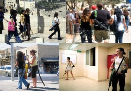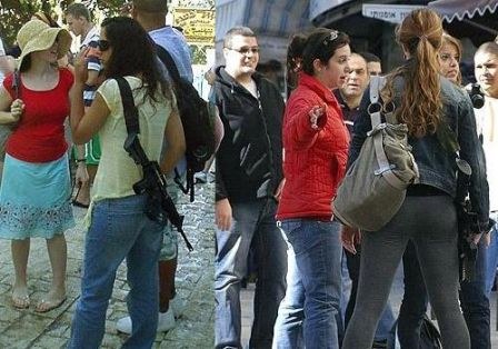 觀察蘿蕾博客上的照片可知,這些年輕女孩可能是陸軍士兵,從她們槍把子上面的紫藍(lán)色綢帶上看出來(lái),有些是專業(yè)的M16步槍,屬軍用裝備,而非私人護(hù)身之用。加上以色列人不管男女都要服兵役,因此就算是回家休假槍也不離身,才能確保生命安全。