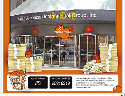 中新網(wǎng)3月25日電 據(jù)香港《明報》25日援引外電報道,美國AIG花紅風(fēng)暴,令民眾氣憤難平,自由派網(wǎng)站日前在網(wǎng)上開設(shè)“擲西紅柿”泄憤游戲。網(wǎng)民們可邊詛咒、邊瞄準(zhǔn)AIG大樓入口圖片狂擲虛擬西紅柿。