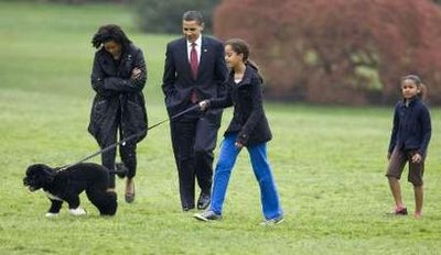 奧巴馬一家早前選定六個月大的葡萄牙犬“波”為白宮第一狗,他們首次在白宮南草坪放狗,“波”表現活躍,一對女兒很喜歡這只狗。