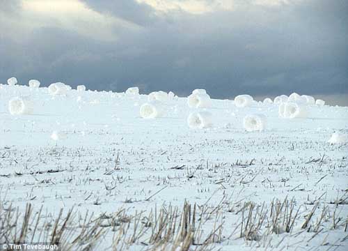 這幅景象是在美國(guó)愛達(dá)荷州的大草原上被Tim Tevebaugh偶然發(fā)現(xiàn)的,他稱:“在我早晨開車上班的路上,我從沒有見到過它們(雪卷),所以它們一定是幾小時(shí)內(nèi)在這片地方產(chǎn)生的!