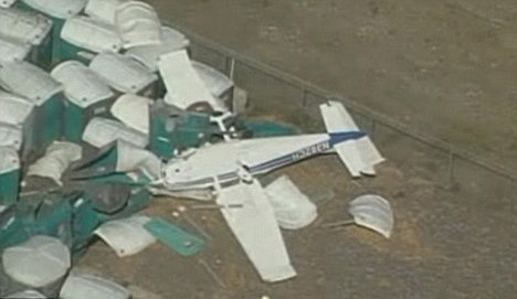 中新網(wǎng)5月6日電 美國(guó)一架塞斯納小型飛機(jī)日前緊急迫降在一個(gè)移動(dòng)廁所上,飛行員幸免遇難。這架塞斯納182飛機(jī)在美國(guó)華盛頓州塔科馬東南的一個(gè)機(jī)場(chǎng)起飛后就出現(xiàn)了引擎故障。