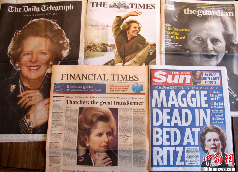 英國各大媒體頭版報(bào)道撒切爾夫人去世消息