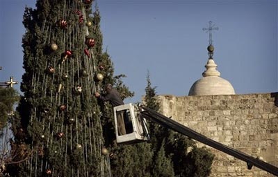 中新網(wǎng)12月16日電 伯利恒當?shù)貢r間12月15日,巴勒斯坦居民點亮了一顆四層樓高的圣誕樹,開啟了巴以和平進程陷入僵局7年以來最熱鬧的圣誕節(jié)慶祝。據(jù)美聯(lián)社報道,伯利恒當?shù)毓賳T表示,由于近期巴以重啟和談進程,西岸地區(qū)氣氛空前和諧,今年前往伯利恒的朝圣者和游客人數(shù)可能達到七年最高峰。