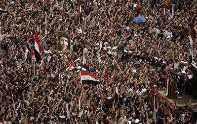 另據(jù)報(bào)道,伊拉克民眾擠滿了通向巴格達(dá)“天堂廣場”(Firdos Square)的道路。此次抗議集會(huì)由伊拉克什葉派主要反美人物薩德爾發(fā)起。游行隊(duì)伍冒著小雨從巴格達(dá)城北的薩德爾城出發(fā),一路游行至市中心的“天堂廣場”。