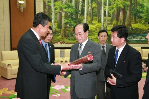 中新網(wǎng)5月6日電 中國(guó)駐朝鮮大使館網(wǎng)站消息,5月5日,朝鮮最高人民會(huì)議常任委員會(huì)委員長(zhǎng)金永南受朝鮮勞動(dòng)黨總書(shū)記金正日的委托,在萬(wàn)壽臺(tái)議事堂會(huì)見(jiàn)了中國(guó)駐朝鮮大使劉曉明。劉大使請(qǐng)金永南委員長(zhǎng)轉(zhuǎn)達(dá)中共中央總書(shū)記、國(guó)家主席胡錦濤致金正日總書(shū)記的口信和親切問(wèn)候。金永南委員長(zhǎng)表示感謝并允轉(zhuǎn)達(dá),同時(shí)也請(qǐng)劉大使轉(zhuǎn)達(dá)金正日總書(shū)記對(duì)胡錦濤總書(shū)記的親切問(wèn)候。