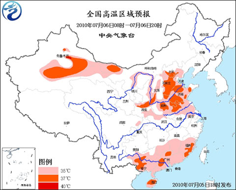 預(yù)計(jì),明天白天,甘肅西北部、內(nèi)蒙古中西部的部分地區(qū)、陜西東部和南部、山西中部和西南部、華北大部、黃淮大部、湖北西北部、江淮東部、湖南南部、江西南部、華南大部等地有35~37℃,北京、河北中南部、山東北部等地的部分地區(qū)有38~40℃的高溫天氣。