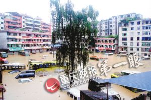 前晚9時許,酉陽縣城開始下起暴雨。昨晨,酉城河水也漫過河床,涌向縣城主街的低洼角落。至上午10時許,縣城東風壩、城北車站、小商品一條街、桃花源中路等街道門面進水,水深1.5米左右,酉陽報社被淹,停放在街邊、車站內(nèi)的許多車輛被水淹沒。