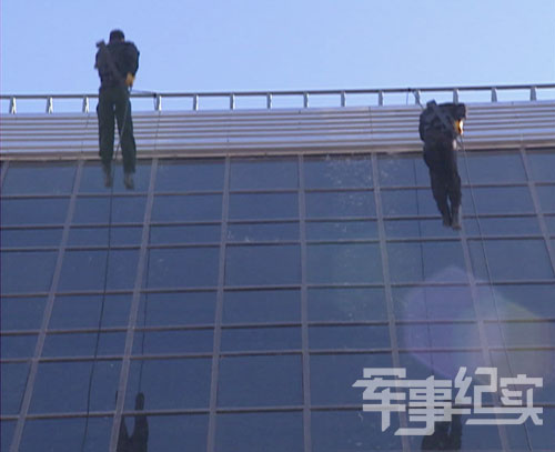 僅僅用時(shí)20多秒,惠寶林便從地面抵達(dá)了十層大樓的樓頂。選擇好位置,惠寶林便悄悄地固定好繩索,準(zhǔn)備下滑。