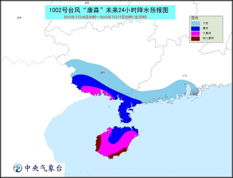 受其影響,16日晚上到17日白天,南海西北部、瓊州海峽、海南省及其沿海、廣東西部沿海、廣西沿海、北部灣將有7~10級大風,“康森”中心經(jīng)過的附近海面或地區(qū)的風力可達11~12級,部分海域或地區(qū)陣風可達13~14級;廣東西南部、廣西南部、海南將有大到暴雨,其中海南、廣西南部的部分地區(qū)有大暴雨,海南南部和西部的局地有特大暴雨。