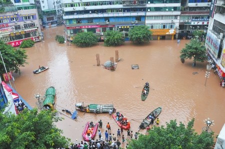 截至昨晚7點(diǎn)半,途經(jīng)達(dá)州城區(qū)的洪水水位已達(dá)到282.61米,超過(guò)警戒水位4.7米,洪水使整個(gè)達(dá)州城超過(guò)1/3的面積進(jìn)水,濱河路淹到二樓,全城大面積停水,逾5000家門市的貨物轉(zhuǎn)移。達(dá)州河市機(jī)場(chǎng)也進(jìn)水。