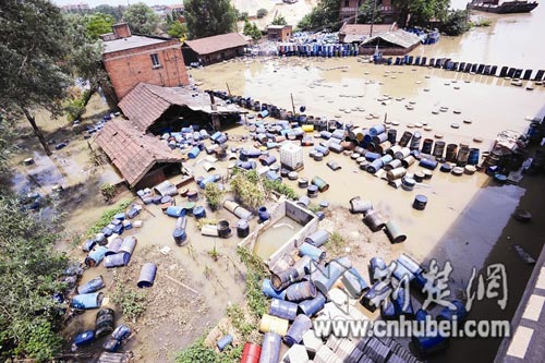 漢江長豐橋江段漢口一側(cè)一倉庫被淹,數(shù)百只化工鐵桶和塑料桶浸泡在江水中,另有數(shù)千只桶堆在江中的平臺上。昨日,記者聞訊立即向環(huán)保部門反映,東西湖區(qū)環(huán)保局連夜組織打撈。