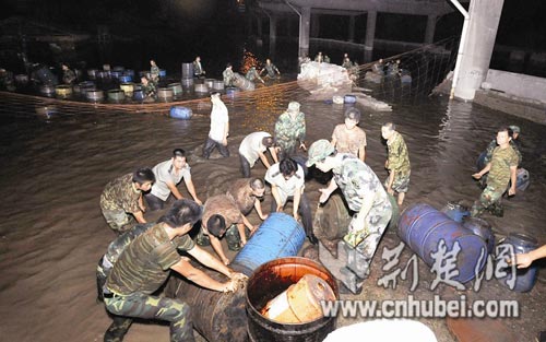 昨晚8時許,東西湖區(qū)環(huán)保局監(jiān)察大隊(duì)夏大隊(duì)長表示,接到反映后,下午立即展開了調(diào)查,發(fā)現(xiàn)部分桶內(nèi)還有液態(tài)物質(zhì)。東西湖區(qū)政府立即組織500多名民兵預(yù)備役人員,配合化工桶倉庫的業(yè)主,挑燈夜戰(zhàn)連續(xù)打撈和轉(zhuǎn)移,包括江中平臺上的化工桶在內(nèi),共3000只化工桶將不會在江中過夜;與此同時,區(qū)環(huán)保監(jiān)測站對桶內(nèi)液態(tài)物質(zhì)進(jìn)行化驗(yàn),同時對浸泡化工桶的江水,每隔兩小時取一次樣進(jìn)行化驗(yàn),密切監(jiān)測該江段的水質(zhì)情況。
