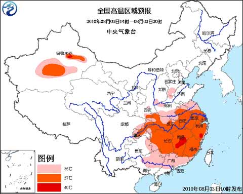 中央氣象臺2010年8月3日10時繼續(xù)發(fā)布高溫橙色預(yù)警: