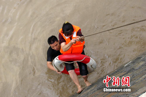 消防官兵搜尋到中攤堡大道,聽到中普建設楓香樹村安置房與中攤堡安置房交界處傳來求救聲音,利用強光手電筒發(fā)現(xiàn):洪水已將4名來不及疏散的施工人員團團包圍,工人在樓頂揮手、呼喊求救!安灰,我們馬上想辦法過來救你們”。由于水流很急且到處都是施工隊挖的暗溝,時間緊迫,消防站余柯政站長來不及多考慮,立即下令,將保險繩拴在消防車上,余站長和劉飛穿上救生衣,綁好安全繩后,帶著救生圈慢慢的游到被困群眾位置,將救生衣為民工穿好后,一邊由消防官兵護送一邊由在消防車一邊的其余消防官兵牽引安全繩接應,緊急轉(zhuǎn)移被困群眾。一趟、兩趟、三趟……經(jīng)過近半小時的奮戰(zhàn),成功救出被困工人。