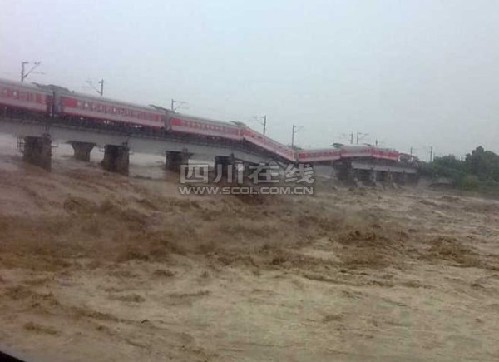 據(jù)廣漢市政府電話報告,鐵路寶成線跨石亭江大橋(廣漢小漢境內(nèi))沖毀兩個橋墩三孔,西安至昆明客運(yùn)車懸掛橋上,廣漢市已積極組織力量正在進(jìn)行搶險和轉(zhuǎn)移旅客。
