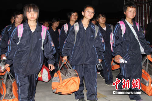 經(jīng)過10小時20分鐘的車程,經(jīng)過406公里的顛簸,下午19點20分,6輛大巴車緩緩駛?cè)胩m州科技外語中學的大門,舟曲一中高一年級240名學生和12名教師第一批平安到達“新家”。