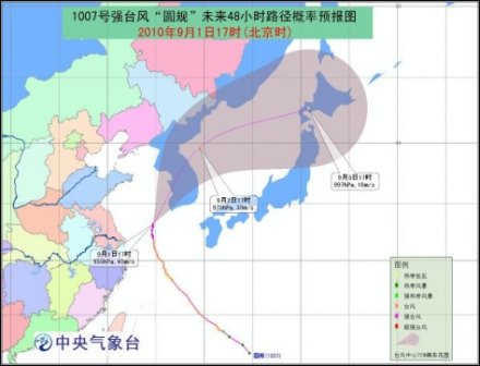 今年第7號臺風(fēng)“圓規(guī)”于9月1日13時在東海北部海面上加強(qiáng)為強(qiáng)臺風(fēng),17時其中心位于韓國濟(jì)州西偏南方大約170公里的海面上,就是北緯33.2度、東經(jīng)124.7度,中心附近最大風(fēng)力有14級(45米/秒),中心最低氣壓為955百帕。