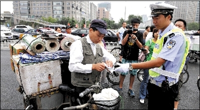 昨天上午9點,記者在東單路口看到,8名民警“把守”在路口4個方向,由于正值上班高峰,路口騎車人較多,大部分人能等待紅燈,幾名想“闖關”的騎車人被民警和協(xié)管員攔住。市民小陳騎電動自行車載人,被執(zhí)勤民警攔下并處以罰款20元。記者注意到,民警處理的多是自己加裝動力裝置的三輪車!白孕屑友b動力裝置很危險。”民警說,行人、非機動車的違法行為主要有騎車帶人、逆行、闖紅燈等。昨天上午兩個小時內(nèi),僅東單路口一處,民警就處罰了20多起行人、非機動車的違法行為。
